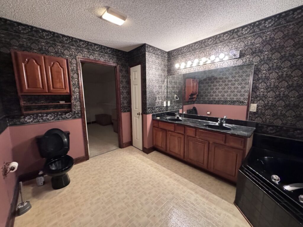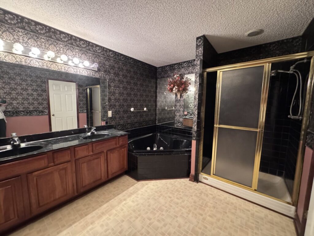 Now for the largest project. The main bath looked like it was right out of an Austin Powers movie, complete with black jacuzzi tub, tiny black and gold shower, black toilet and wall paper to match.
