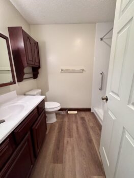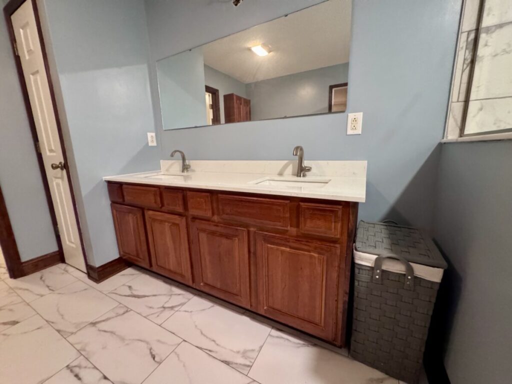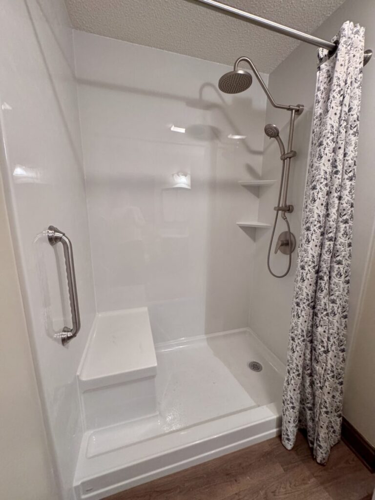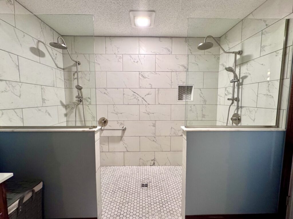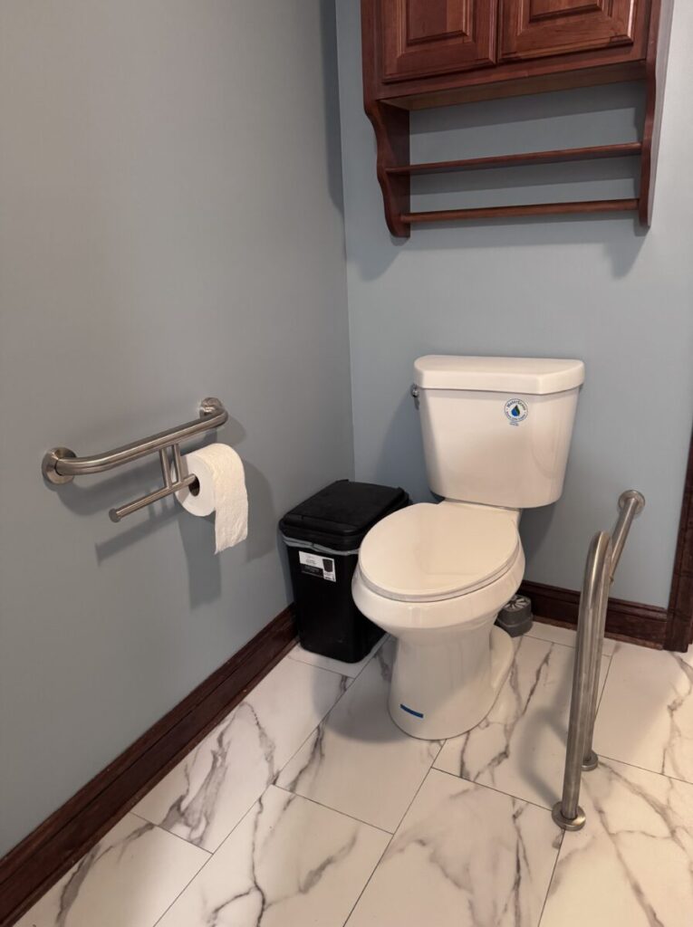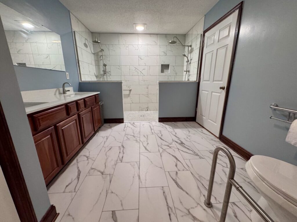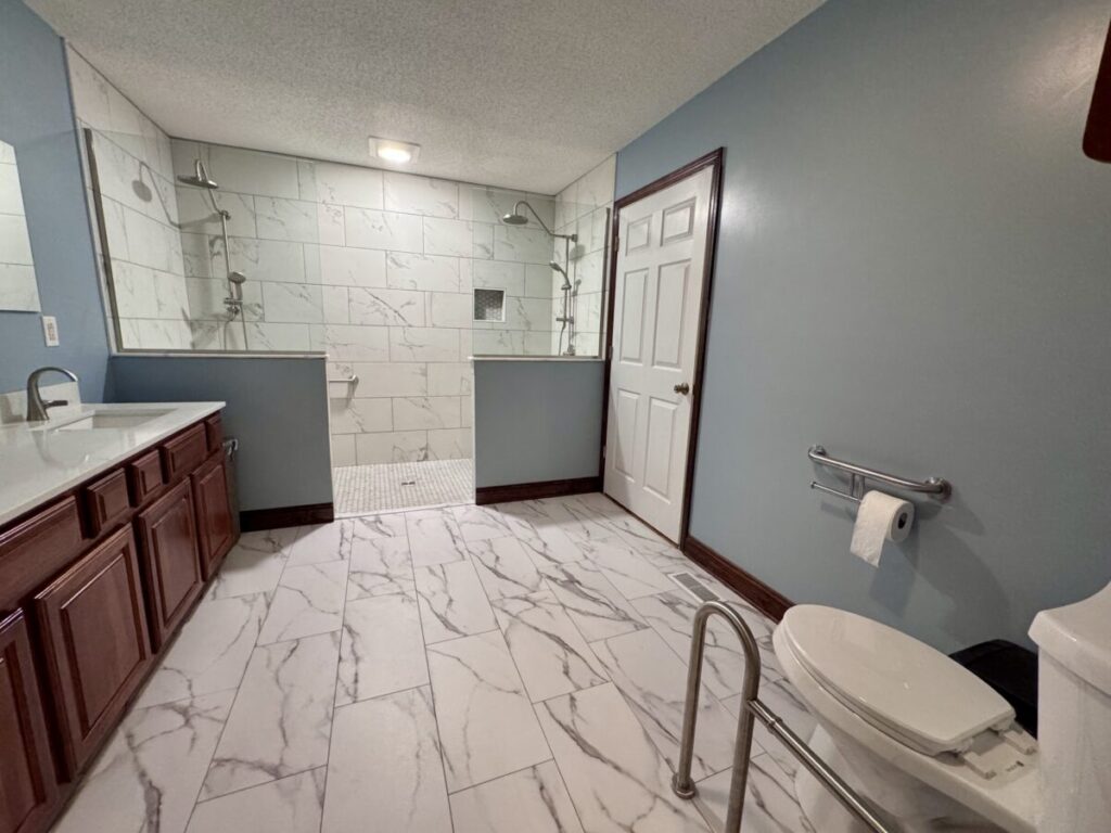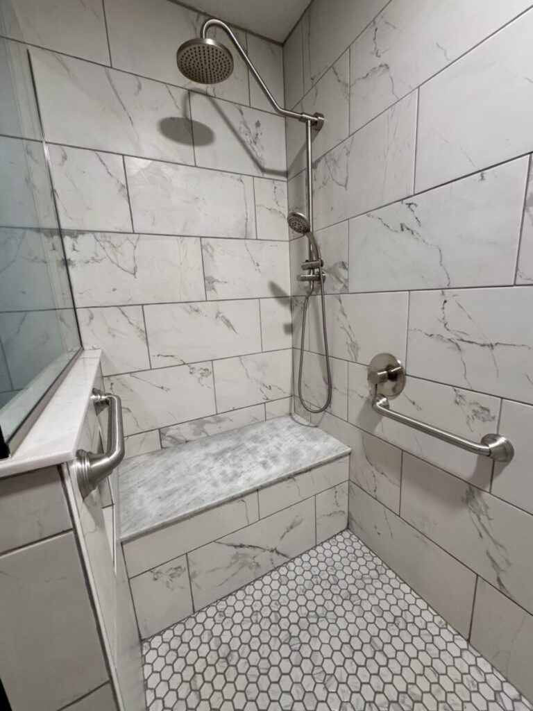 Grab bars in the shower were the most important thing to the client. It was my job to think of all the other things they didn’t, like a wider entry door, no shower door to fuss with, handheld showers and a zero threshold. The bulk of the budget was spent on the 42X108 shower but there was also an odd size vanity to deal with and specialty grab bars for the toilet area. That vanity really cost me a couple sleepless nights because changing out the top to a vanity that is not standard size meant either splurging on a custom top or finding a work-around. Needless to say we found a work-around but it cost them the use of 1 drawer. They were ok with that. Sometimes you think you’re saving money by keeping an existing fixture and it ends up costing you more in the end, lesson learned.